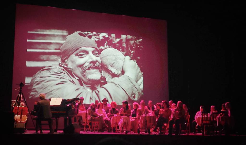 Lo spettacolo si configura in quel format fortemente contemporaneo e destrutturato assai in voga, ove una grande contaminazione di linguaggi (musica, coro, narrazione, recitazione, proiezioni fotografiche) cerca di tratteggiare un ritratto-omaggio fatto di contributi, forse in questo caso fin troppo ellittici (seppur di qualità). Tuttavia coro, musiche, narratore, attrici, tendono ad apparire quasi come gli ingredienti di un cocktail da discoteca molto colorato e seducente ma forse non perfettamente armocromato (citofonare Schlein) i cui liquori hanno densità e nuances differenti che faticano a shakerarsi. (Federico questo cocktail comunque se lo sarebbe gioiosamente scolato alla goccia ridacchiando e tutto d’un fiato!!)